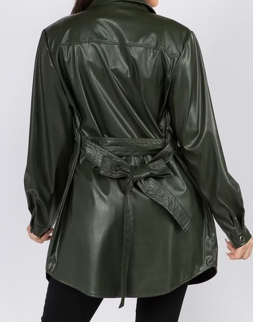 FAUX LEATHER SHIRT JACKET WITH WAIST BAND - SNAP BUTTON CLOSURE FRONT WITH WAIST TIE - SHIRTS LIKE OUTERWEAR WITH FAUX LEATHER FABRIC OR YOU   CAN WEAR IT LIKE A JACKET